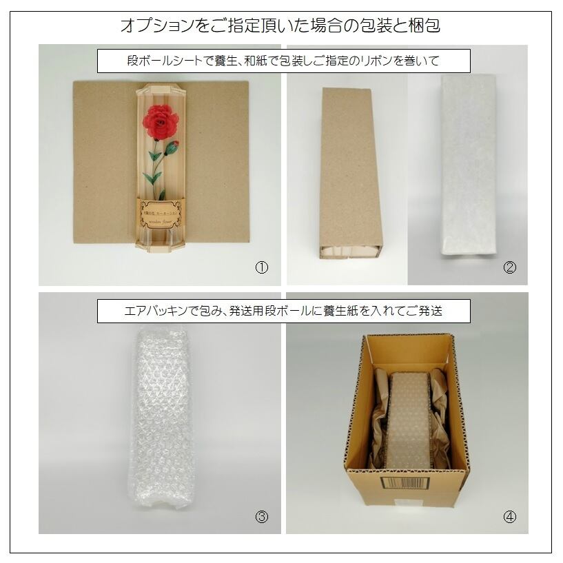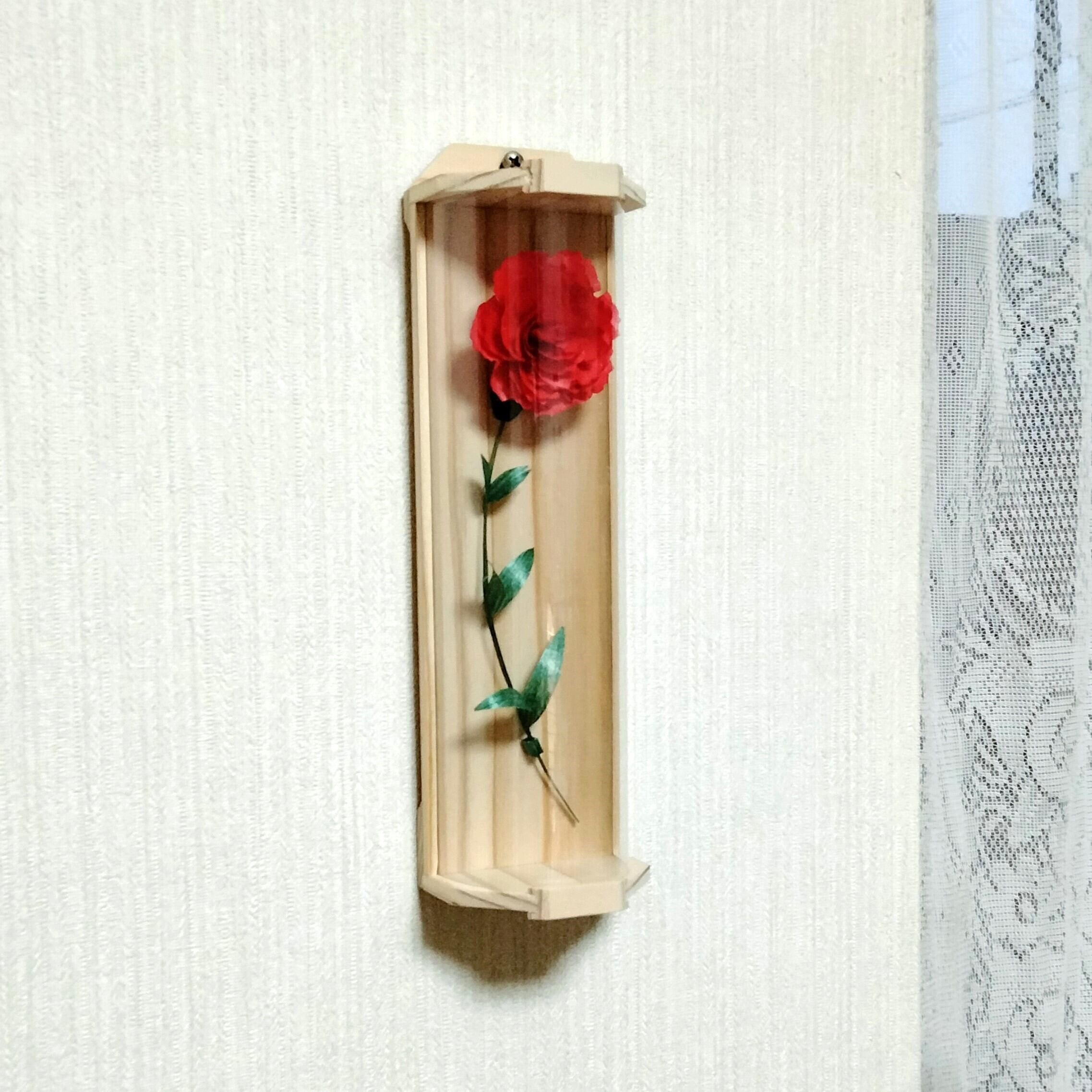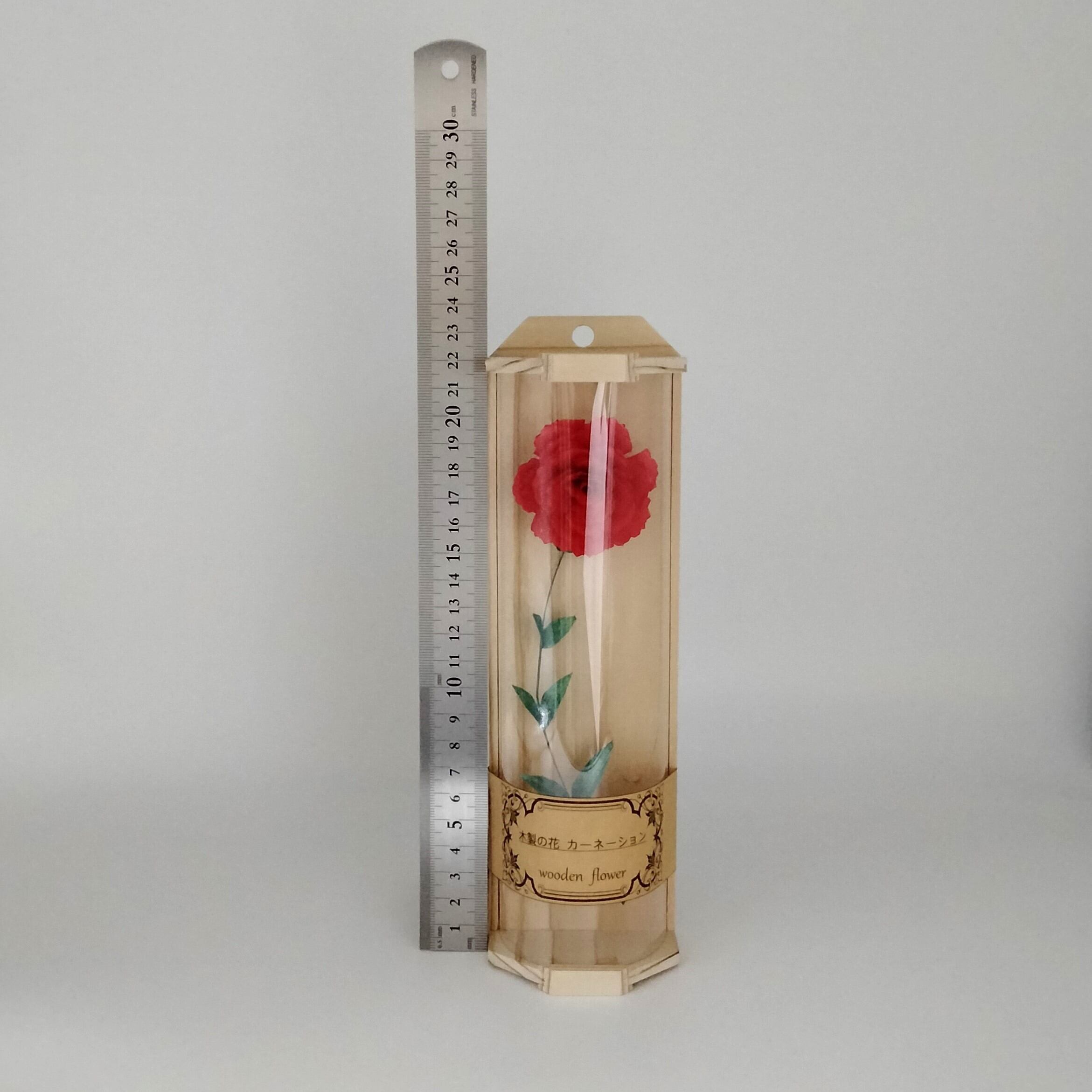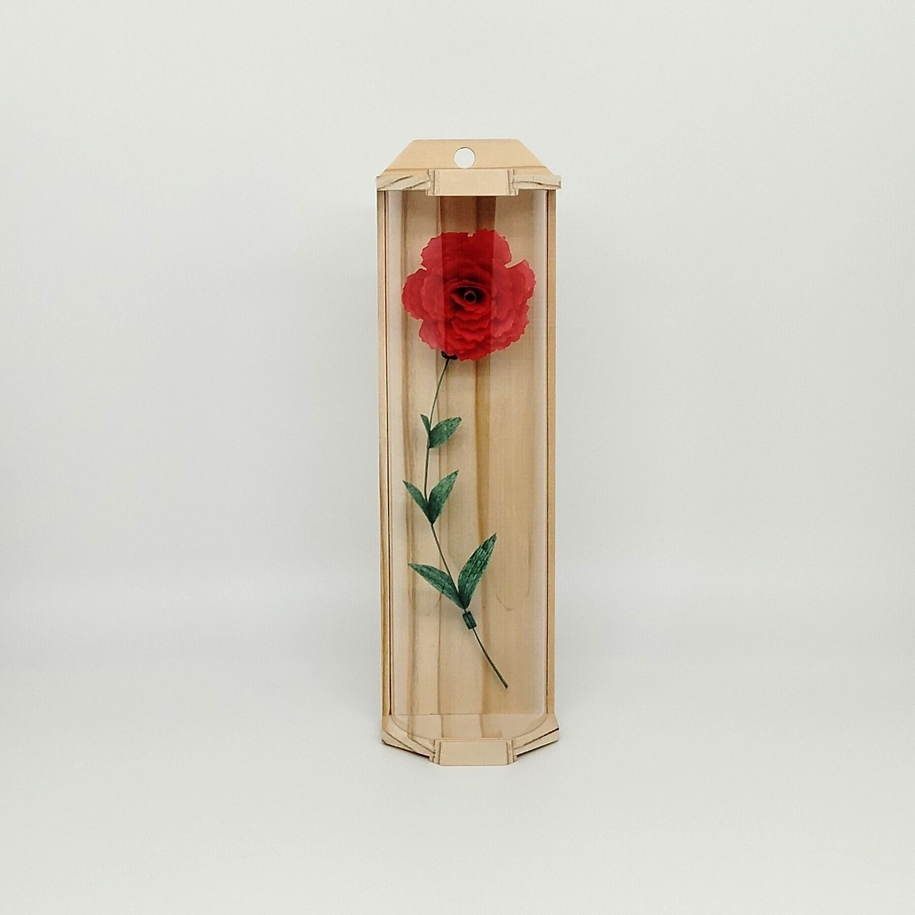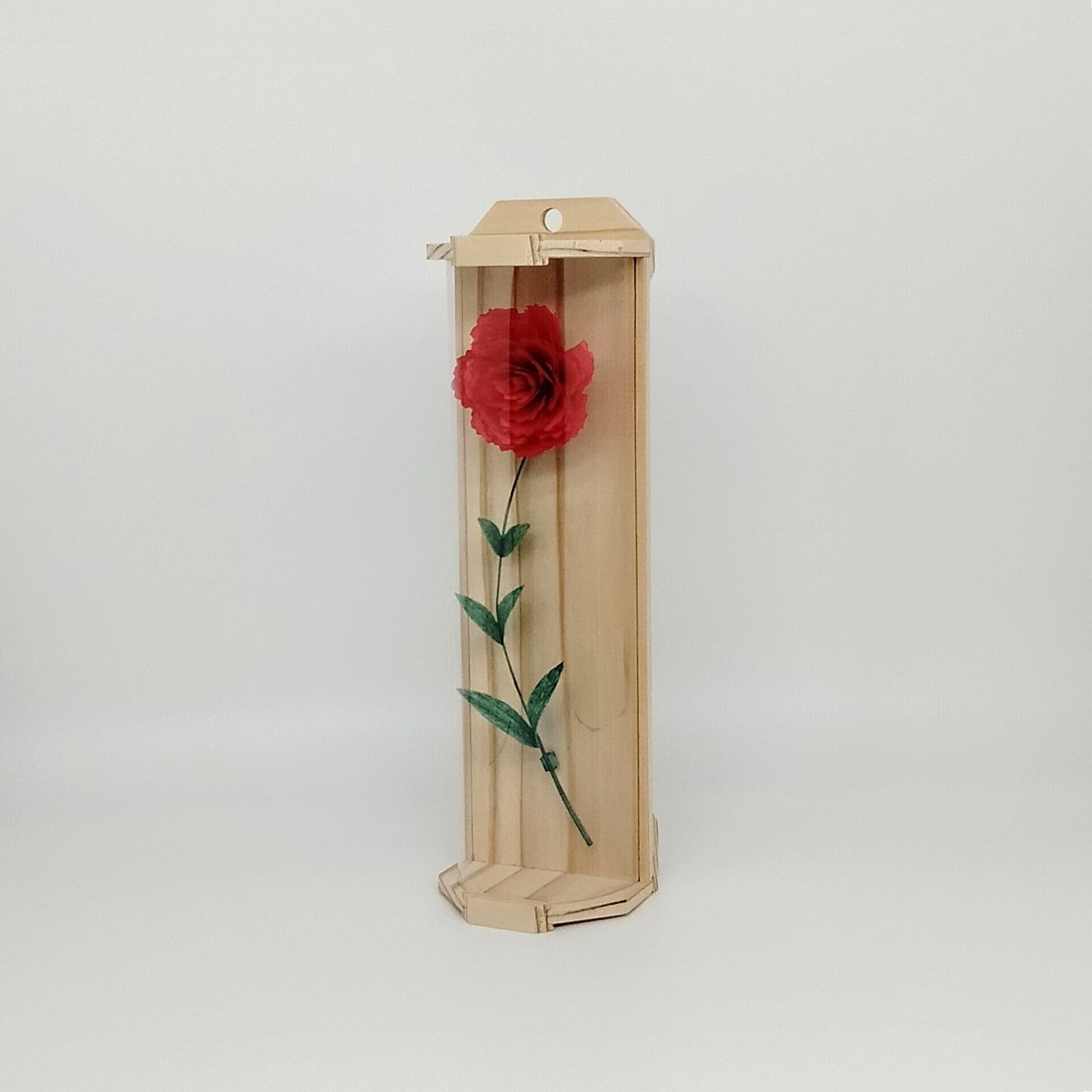 5㎜厚の杉材を使ってケースを作り、0.3㎜厚の松材を使い花びらを一枚一枚加工し貼り合わせ制作したカーネーションの一輪花、木製の花 Wooden Flower です。鮮やかな赤色が特長で、シンプルながらも存在感のあるアイテムに仕上げました。お部屋のインテリアや特別なギフトにも最適です。
