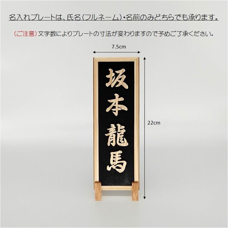 メッセージにて、氏名(フルネーム)かお名前(ファーストネーム)をお送りください。(文字数によりプレート寸法が変わりますので予めご了承ください。)