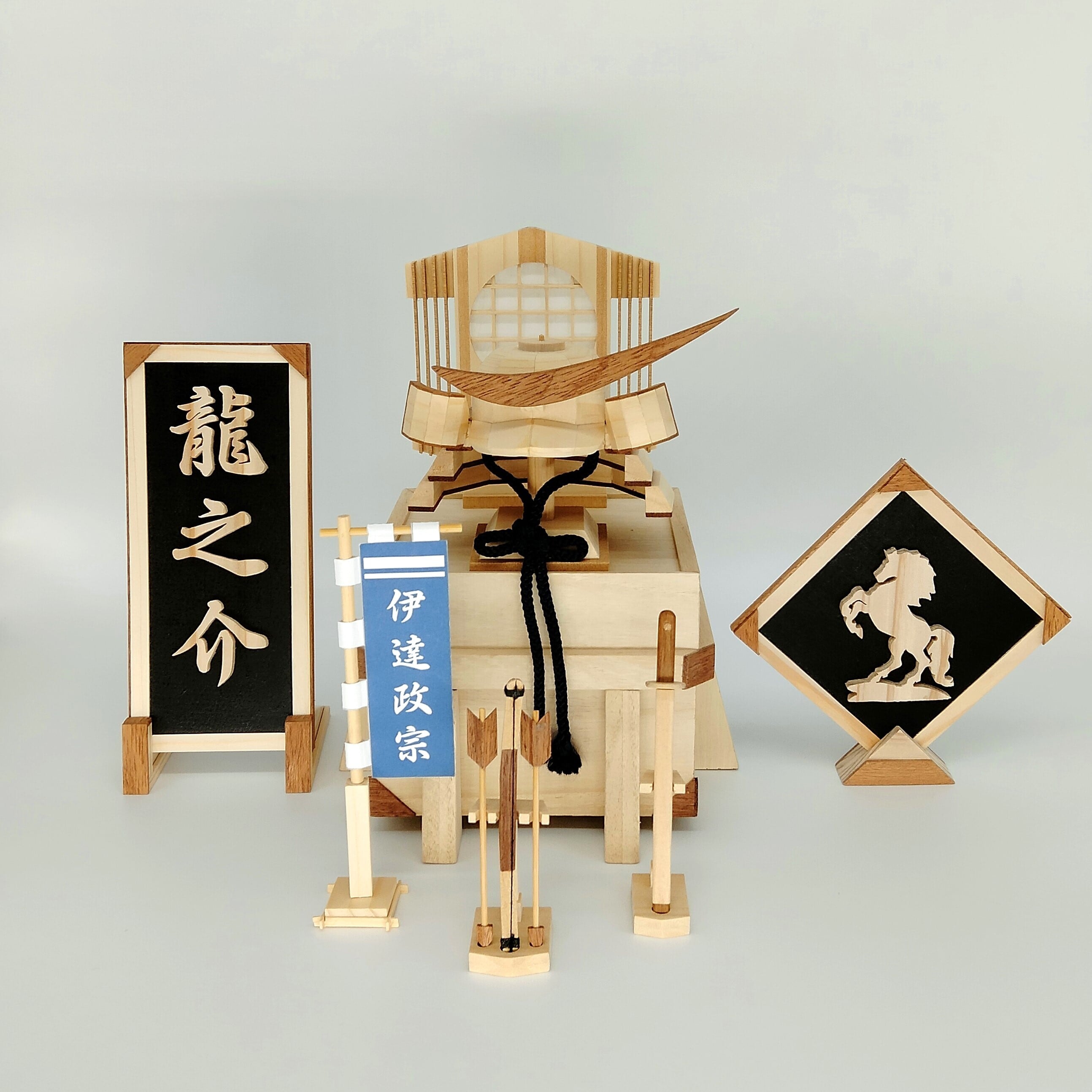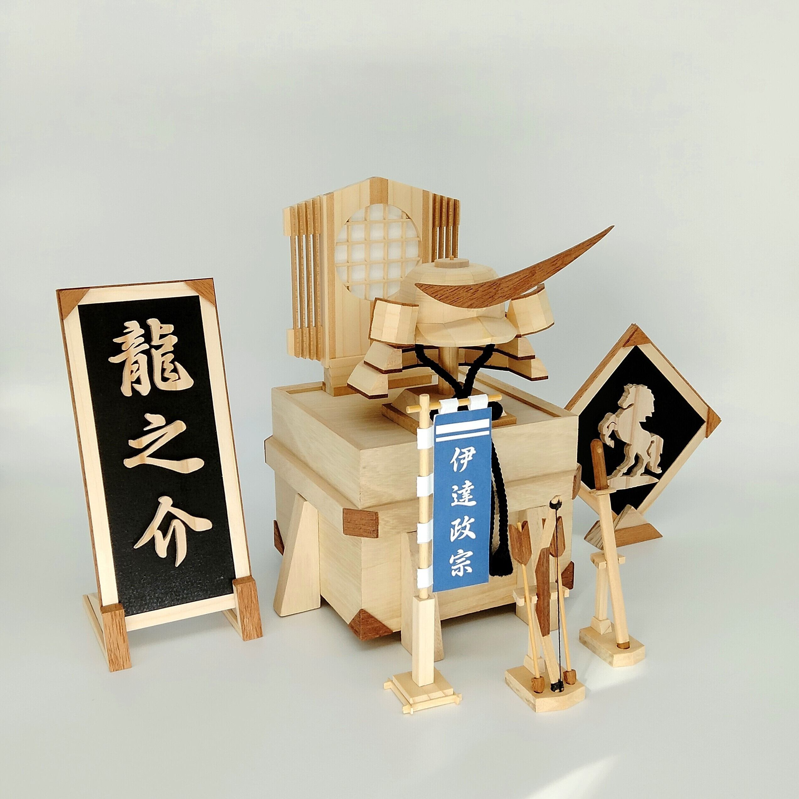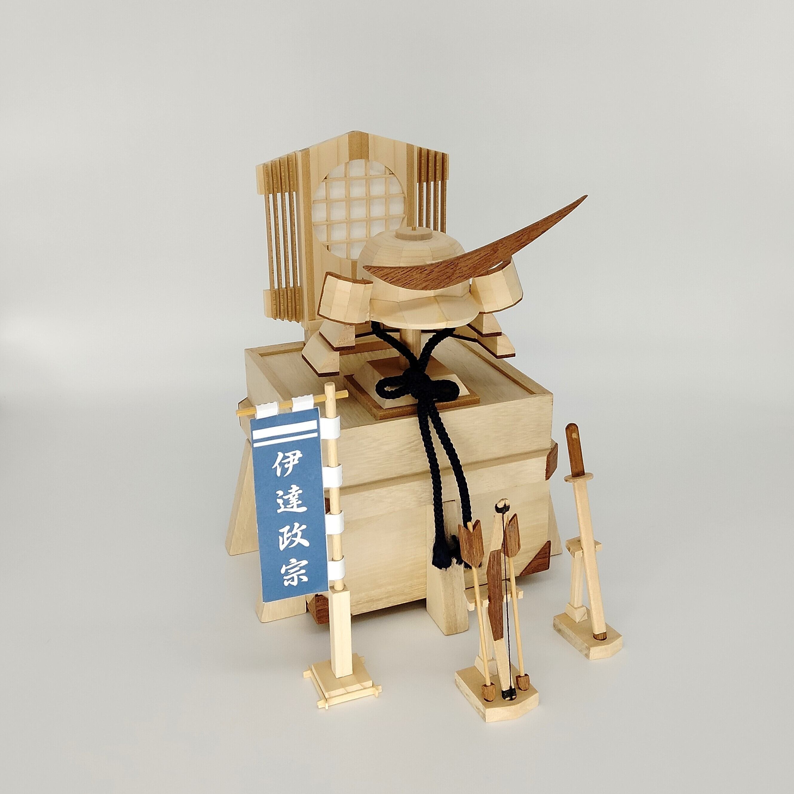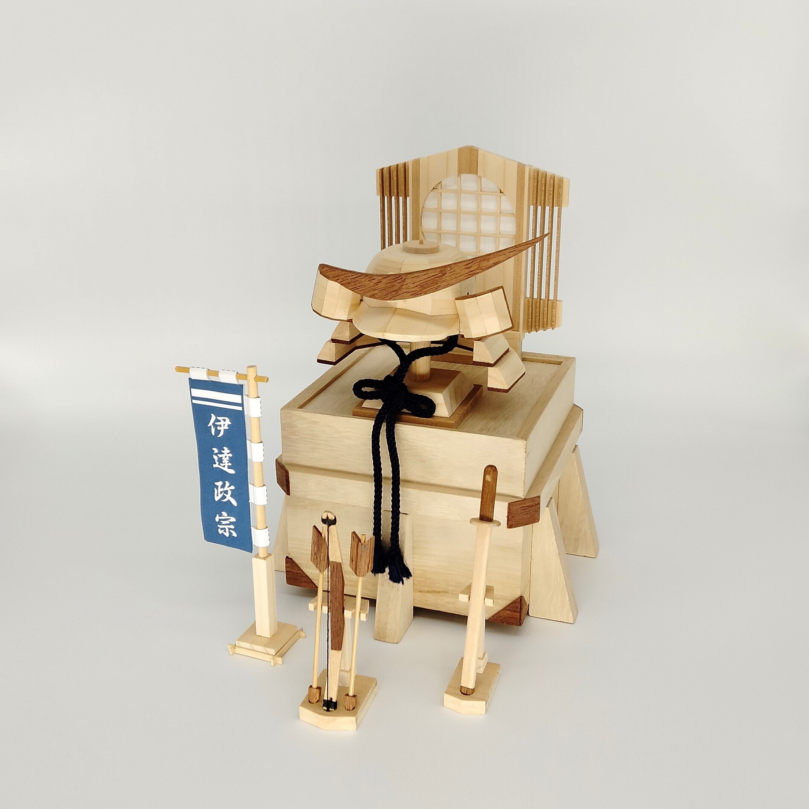 木製 兜 「 伊達政宗」は、木で兜をあしらいコンパクトに仕上げた商品です。