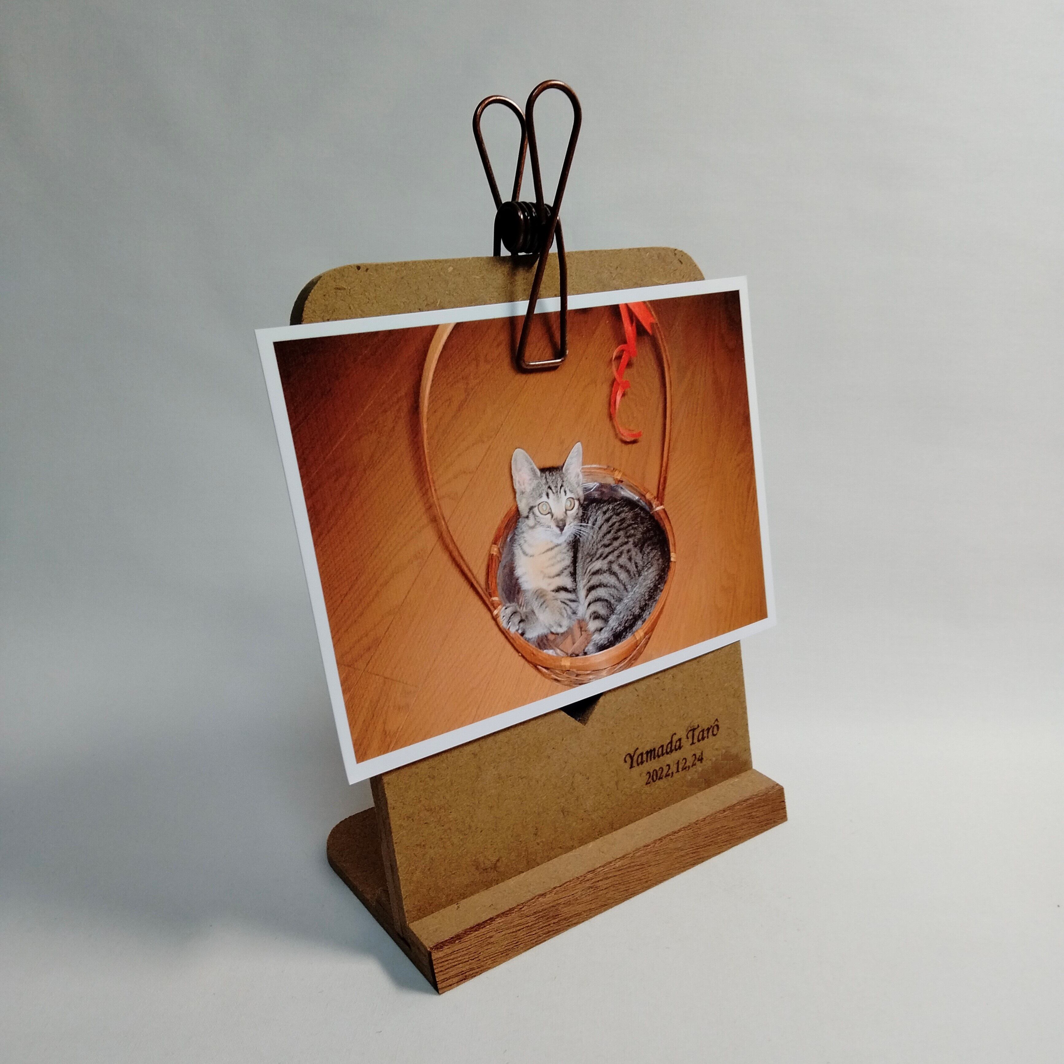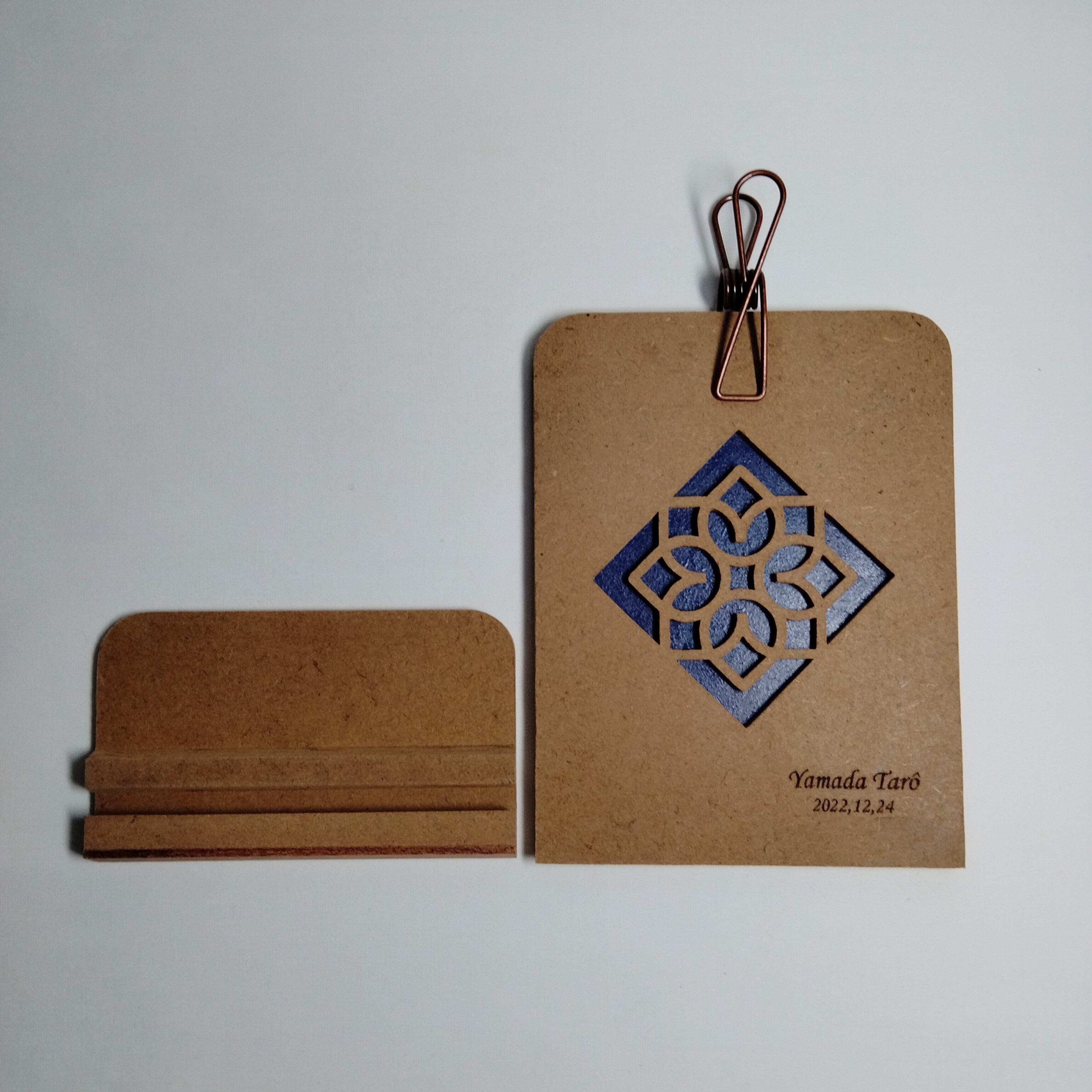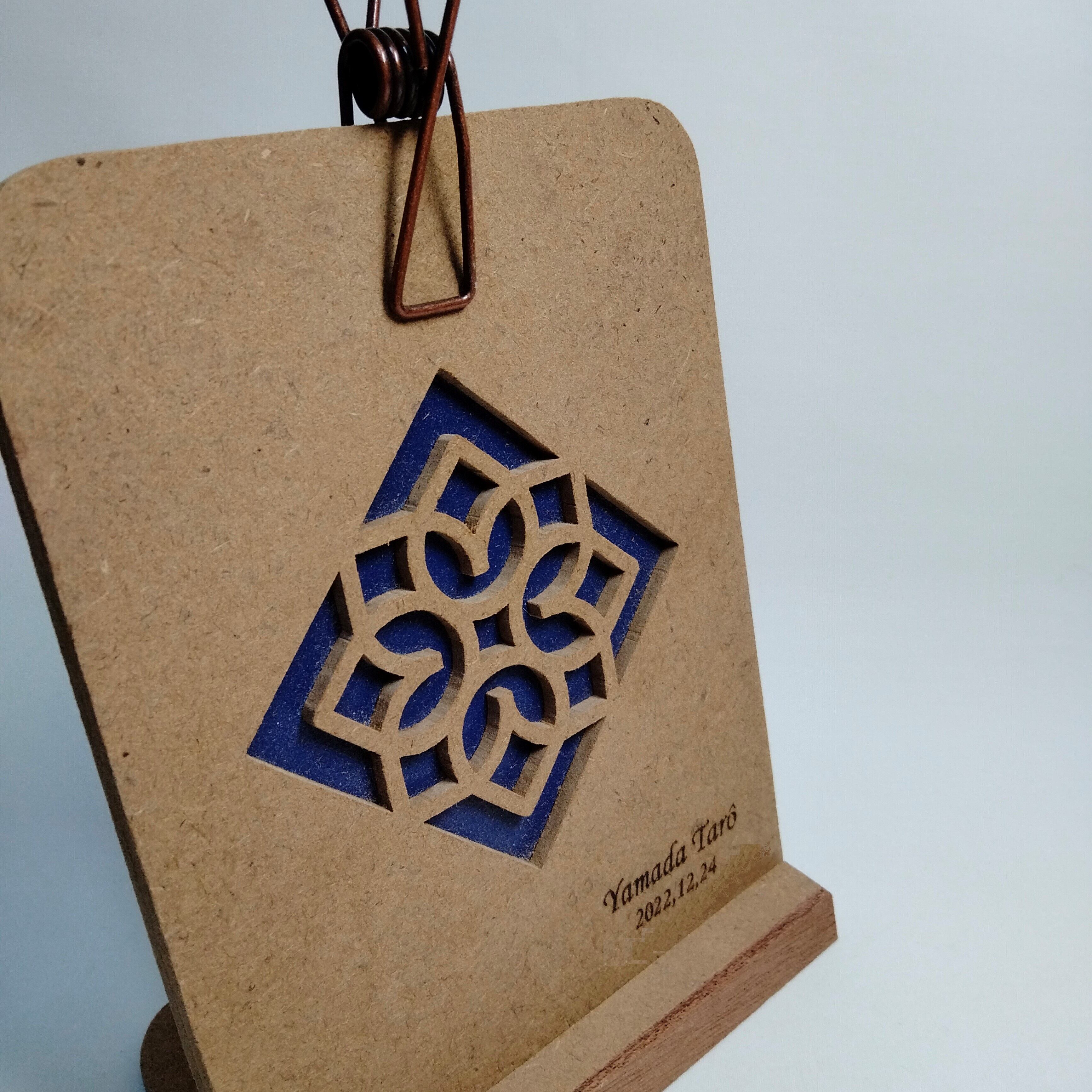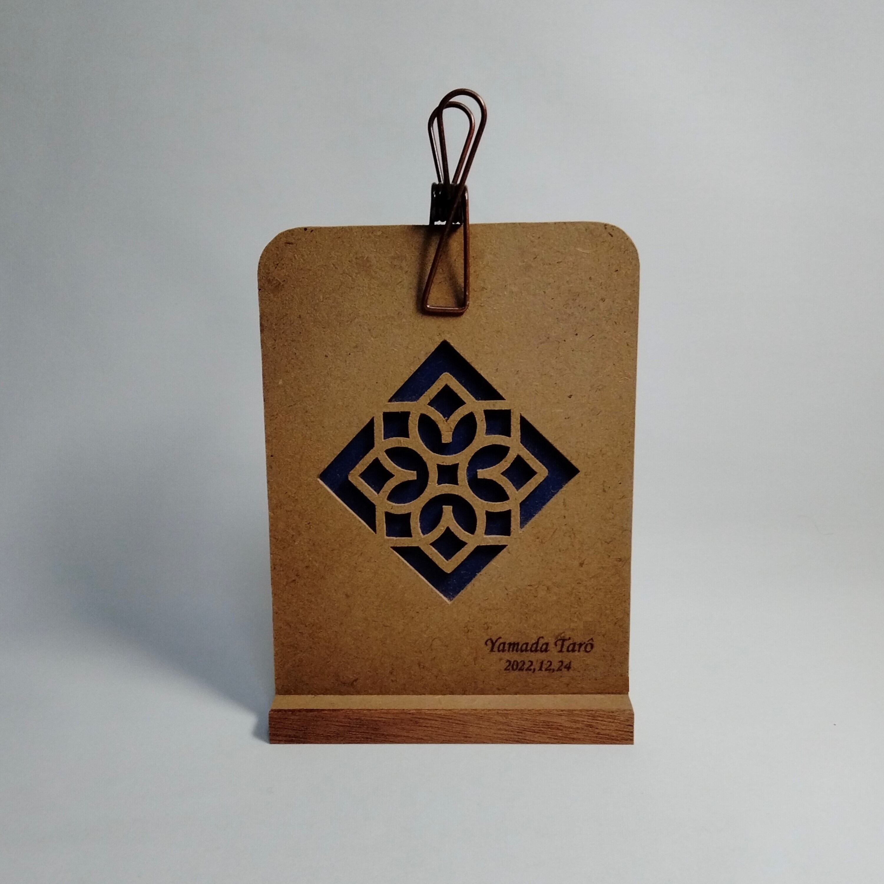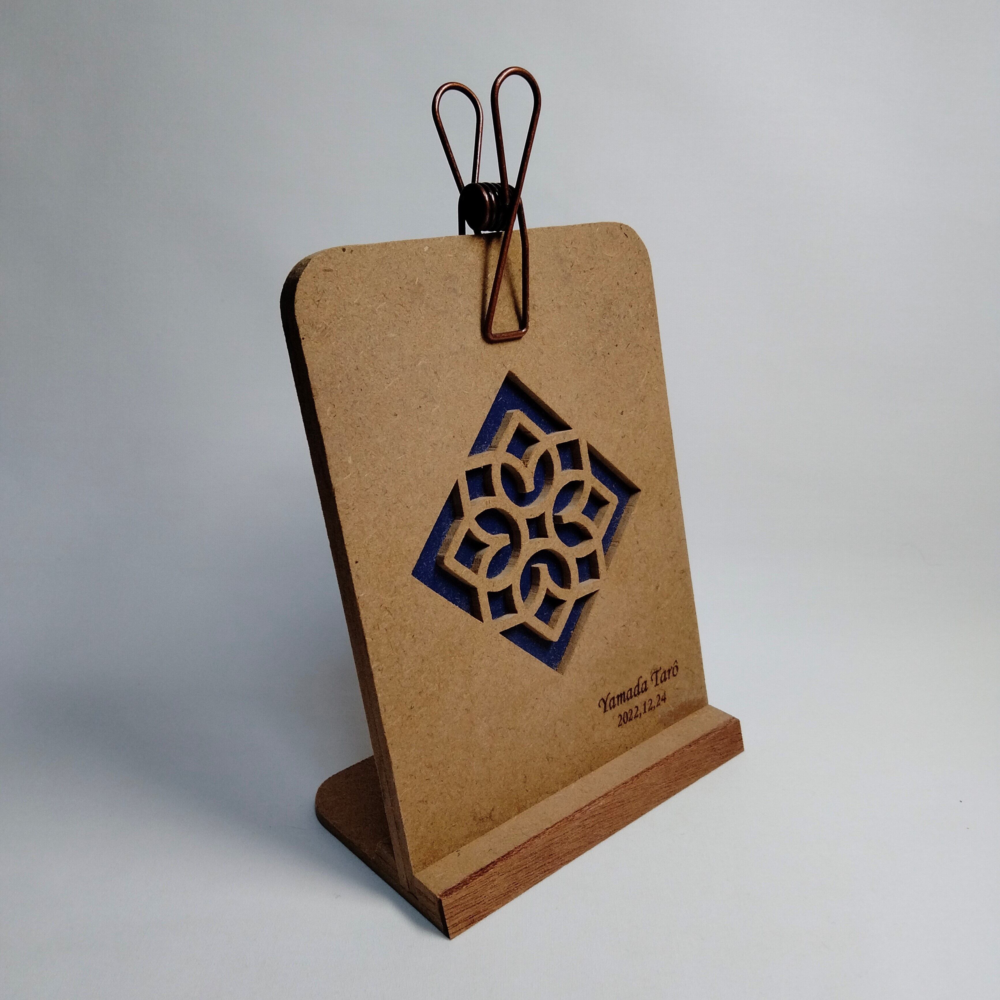 糸鋸を使い模様を一つ一つ切り抜いて制作したクリップスタンド・フォトスタンドです。