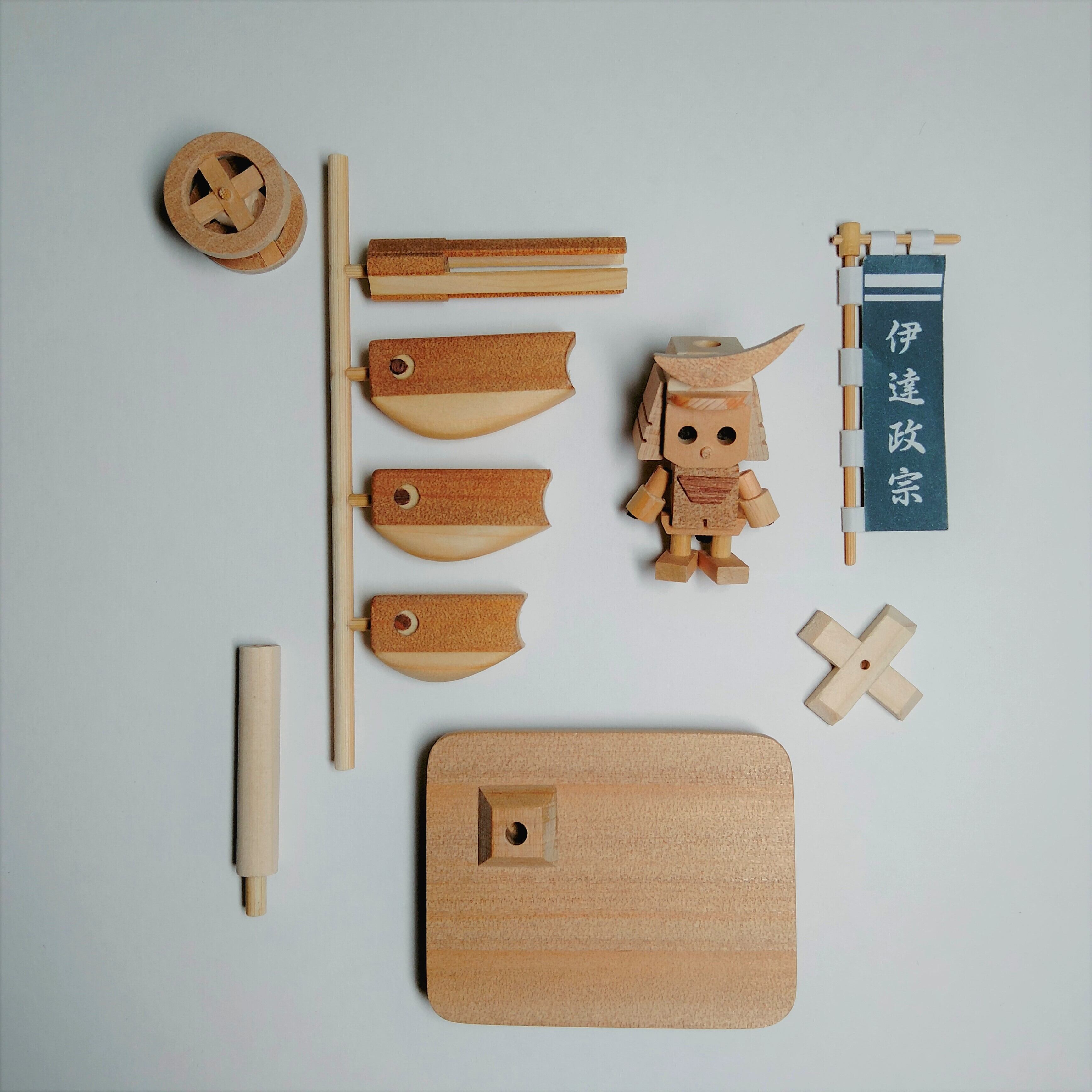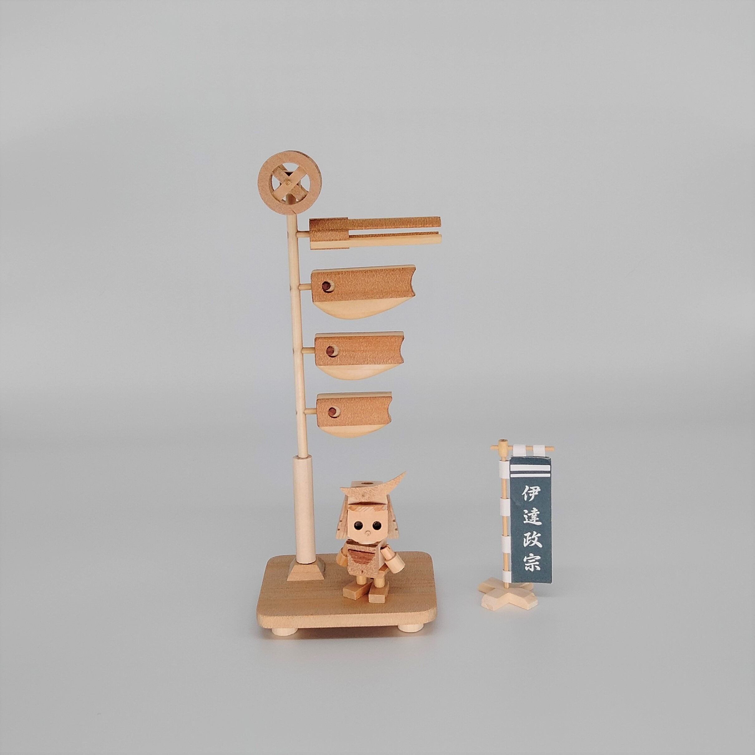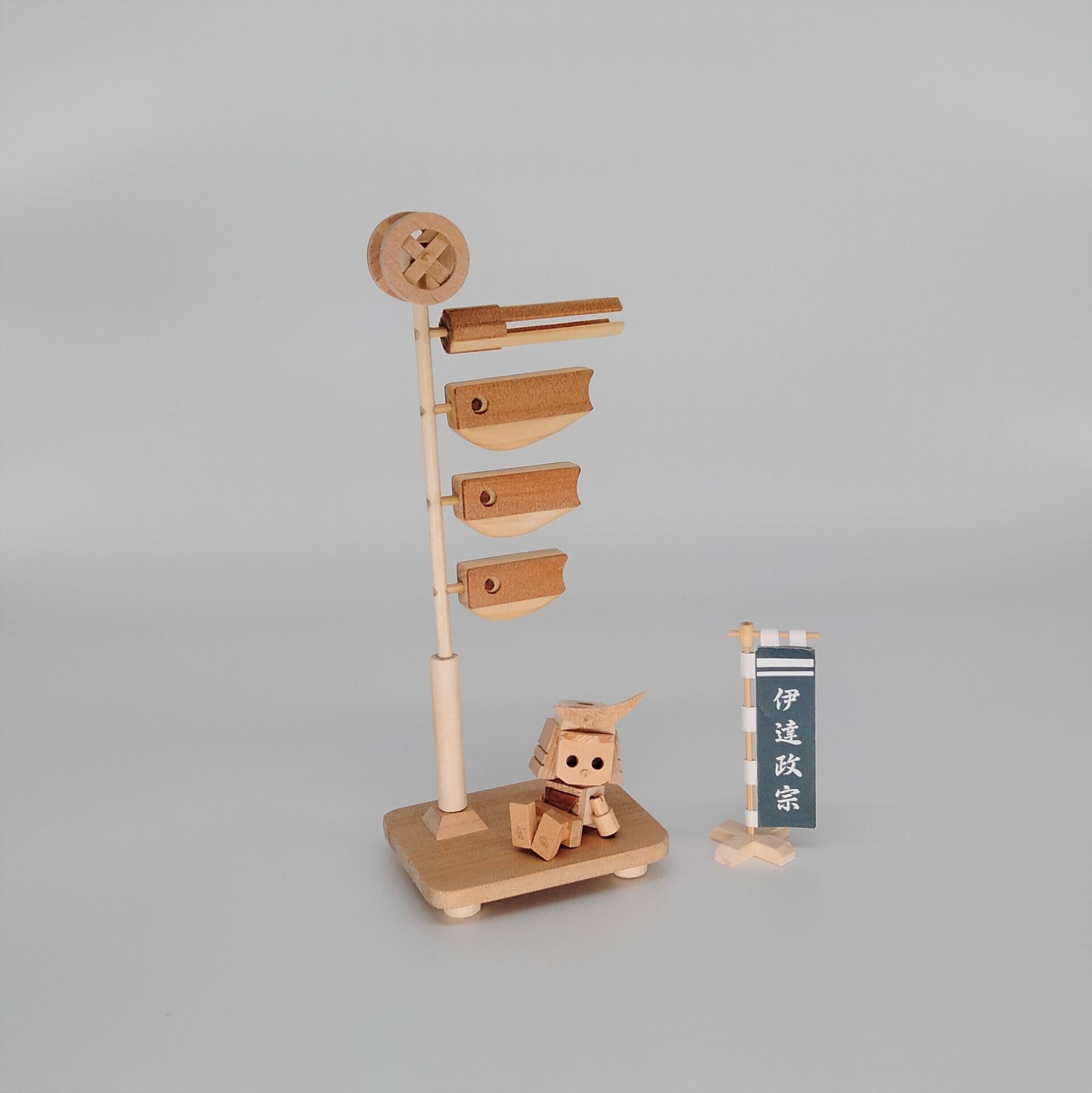 「小さな鯉のぼり 伊達政宗」は木製の鯉のぼりに「ミニロボ 伊達政宗」を付けた商品です。